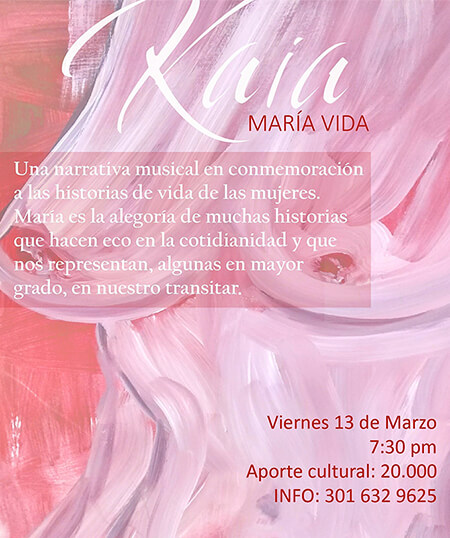 «María Vida» es una propuesta musical y literaria que presenta Kaia en conmemoración del Día Internacional de la Mujer junto a la narradora Francy Elena Moncada. Las dos artistas nos proponen recrear historias de vida de mujeres desde el amor, la duda, el dolor, la pasión, la esperanza.