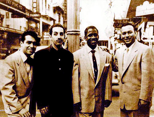 De izquierda a derecha: Charlie Palmieri, Manny Oquendo, Mongo Santamaría y Vicentico Valdés en el sector de China Town en San Francisco, California, 1952. Fotógrafo desconocido. Tomada de Salsa and Latin Jazz Calendar, 2007 de Jesse “Chuy” Varela. —Herencialatina.com
