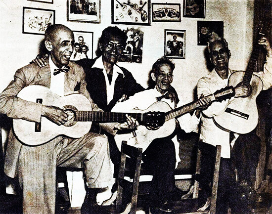“Aquí están, de izquierda a derecha, Rosendo Ruiz, Sindo Garay y Alberto Villalón, milagrosamente reunidos por el compañero Quintero para una información que éste escribió sobre los trovadores cubanos. Ruiz, Garay y Villalón son orientales. Ellos trajeron el bolero a La Habana a principios de este siglo. —(Foto de Cadena)”.