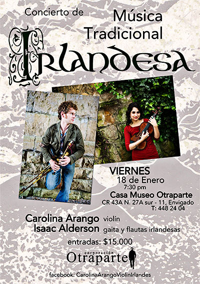 Carolina Arango es una artista visual de la Universidad Javeriana y fue integrante de la agrupación bogotana Awen (música tradicional irlandesa y escocesa) durante cinco años. Entre 2007 y 2008 realizó un diplomado en Música Tradicional Irlandesa en el Instituto “Ballyfermot College of Further Education” de Dublín, donde recibió clases de historia con el maestro y flautista Paul Mc Grattan y de canto con Niamh Parsons. Luego realizó la maestría con énfasis en violín en la Universidad de Limerick, donde tuvo la oportunidad de recibir talleres de más de 20 maestros, incluidos Tommy Peoples y su hija Siobhan, Frankie Gavin, John Carty, Martin Hayes, Oisin MacDiarmada, Liz Carroll, Michelle O’Brien, Eileen O’Brien, Maurice Lennon, Tony Linnane, Gerry O’Connor, Matt Cranitcht y Kevin Burke, entre otros. En 2009 fue escogida junto con otros compañeros para representar a la facultad el día de San Patricio en un evento realizado para Mary McAleese, la presidenta del país. En 2011, junto a su compañera Sarah Hale en la flauta, obtuvo el primer puesto representando a Dublín en la categoría de duetos en las competencias locales de la organización Comhaltas de Irlanda. Ese mismo año fue la violinista oficial del show de danza y música “The Irish House Party” de Dublín y líder de diversas sesiones musicales que se realizaban semanalmente en diversos bares de la ciudad. Actualmente se desempeña como profesora de violín irlandés y es estudiante de gestión cultural en la Universidad Nacional de Córdoba, Argentina, donde fue invitada a participar en el XI Festival Internacional de Música Barroca “Camino a las Estancias” en el marco del encuentro Violines del Mundo.