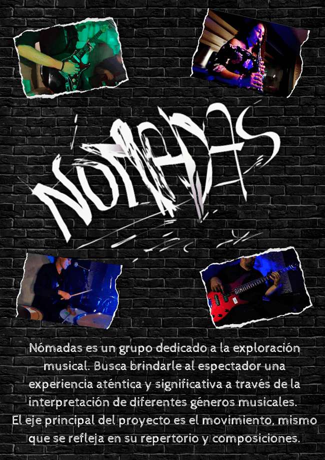 Concierto de la agrupación Nómadas (@nomadasband_oficial), seres errantes y exploradores de diferentes sonoridades, con ilustraciones en vivo de Kato (@kato.ryuu.art), ilustrador, rapero y cosplayer. Los artistas son estudiantes del Tecnológico de Artes Débora Arango de Envigado.