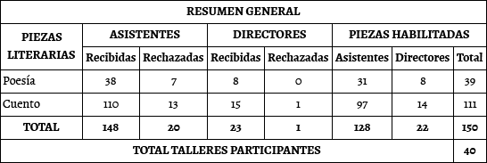 Gracias a todos los directores y asistentes a los talleres que participaron activamente en el concurso de piezas literarias Relata. De las 171 piezas recibidas, 21 no cumplieron con los requisitos establecidos. A continuación relacionamos los resultados generales de la convocatoria: