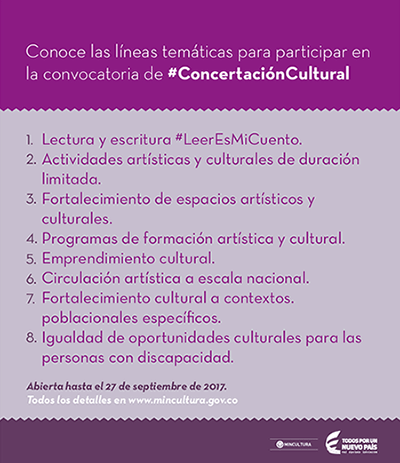 Hasta el 27 de septiembre de 2017 estará abierta la convocatoria del Programa Nacional de Concertación con la que el Ministerio de Cultura busca apoyar, facilitar y hacer visibles actividades, procesos y proyectos artísticos en todo el país. El Ministerio invita a las entidades territoriales, organizaciones e instituciones culturales a que formulen y presenten sus iniciativas.