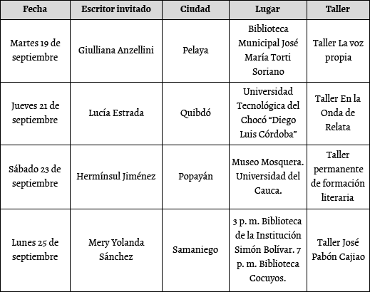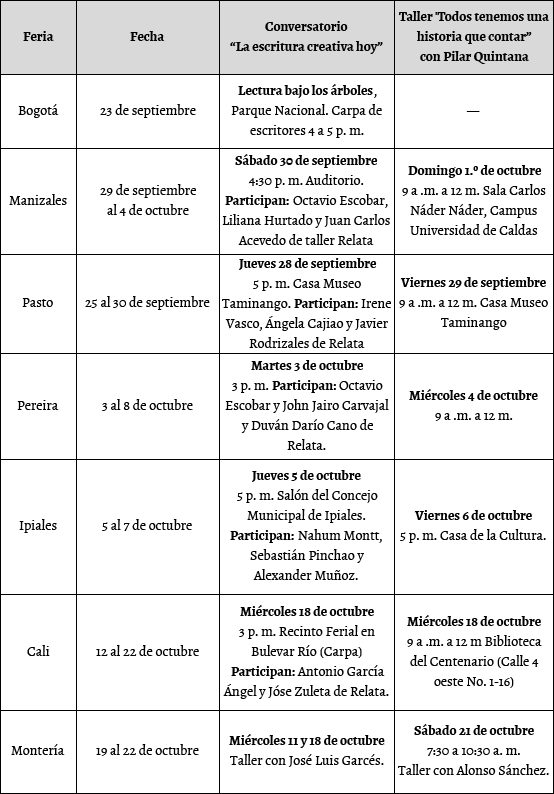 Con la activa participación de docentes, estudiantes, escritores, promotores de lectura y líderes de tertulias y talleres de escritura creativa de las regiones, el Ministerio de Cultura ha abierto espacios de reflexión en torno a la escritura creativa en las ferias regionales del libro de Cúcuta, Bucaramanga y Medellín. Esta iniciativa forma parte de la Estrategia Regional de Fortalecimiento a la Escritura Creativa del Ministerio y continuará en las siguientes ferias del libro regionales: