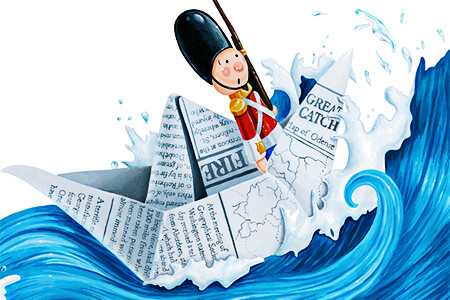 Estaba ya tan cerca de ella, que era imposible evitarla. El barquito salió disparado, pero nuestro pobre soldadito seguía tan firme como le era posible. ¡Nadie podía decir que había pestañeado siquiera! La barquita describió dos o tres vueltas sobre sí misma con un ruido sordo, inundándose hasta el borde; iba a zozobrar. Al soldado le llegaba el agua al cuello. La barca se hundía por momentos, y el papel se deshacía; el agua cubría ya la cabeza del soldado, que, en aquel momento supremo, acordóse de la linda bailarina, cuyo rostro nunca volvería a contemplar. Parecióle que le decían al oído: «¡Adiós, adiós, guerrero! ¡Tienes que sufrir la muerte!».