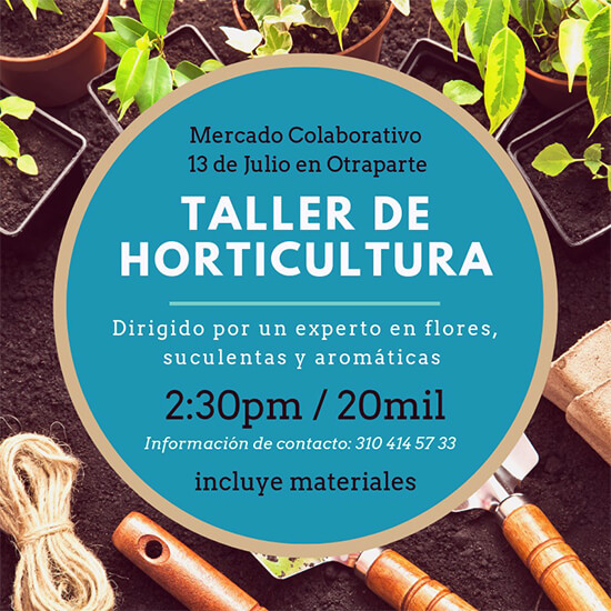 A las dos y treinta de la tarde ofreceremos además un * Taller de Horticultura con cupo limitado de veinte personas y mediante inscripción previa con un aporte de veinte mil pesos. La actividad estará a cargo de Victoria Eugenia Arboleda Gómez, tecnóloga agropecuaria y zootecnista, y en ella los participantes aprenderán sobre los procesos de siembra de diferentes especies, la creación de huertas urbanas y el manejo de suculentas y plantas aromáticas.