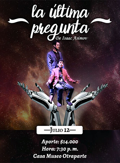 Los narradores orales Juan Camilo Hoyos y Juan Camilo Jaramillo se valen de elementos teatrales y de la conversación escénica para recrear libremente «La última pregunta», cuento de ciencia ficción del escritor ruso Isaac Asimov que indaga por el incierto futuro de la humanidad.