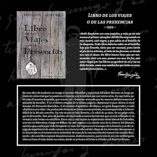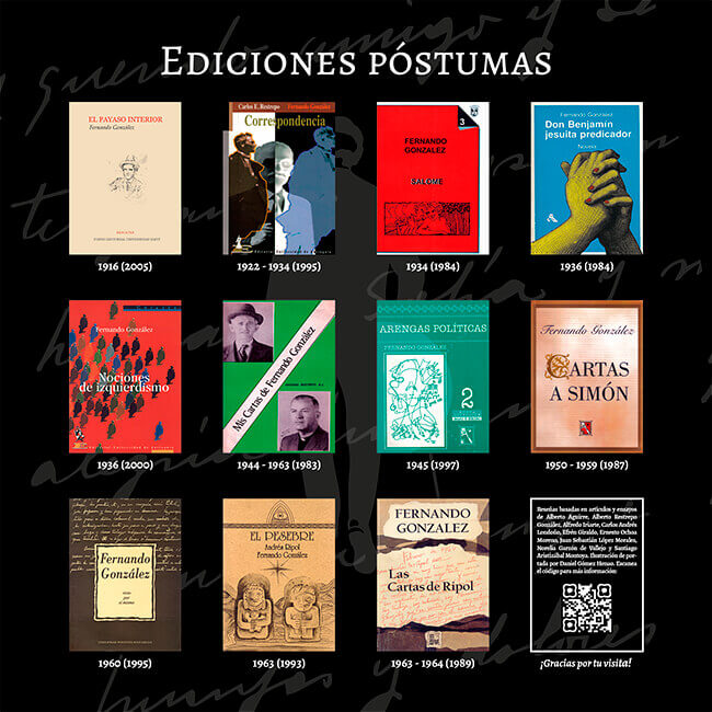 El payaso interior Correspondencia Salomé Don Benjamín, jesuita predicador Nociones de izquierdismo Mis cartas de Fernando González Arengas políticas Cartas a Simón Fernando González visto por sí mismo El Pesebre Las cartas de Ripol Obras publicadas y ediciones