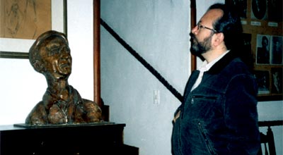 El poeta admiró con atención cada rincón de Otraparte. La escultura es obra de Leonel Estrada.