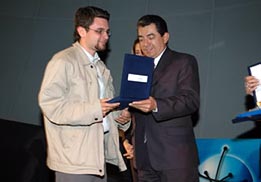 Recibe el premio Sebastián Pineda, Presidente de la Red Nacional de Estudiantes de Literatura y Afines, en representación de Gustavo Restrepo. Entrega el galardón Marco Rodolfo Pérez, Director de Regulación y Relaciones Institucionales de Ericsson.