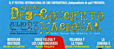 Invitación abierta para asistir al gran Des-Concierto Nacional en el Jardín Botánico Joaquín Antonio Uribe de Medellín. Las agrupaciones que se presentarán esa noche hasta el amanecer representan esa ola de artistas que se manifiestan en letras urbanas, costumbristas, intimistas y colectivas, narrando historias que revelan una cultura con sus fortalezas, vicios y debilidades: Velandia y la Tigra, Meridian Brothers, Jorge Velosa y los Carrangueros y la agrupación Sonora 8, que permitirá estar hasta la madrugada sin riesgo de quedarse dormido.