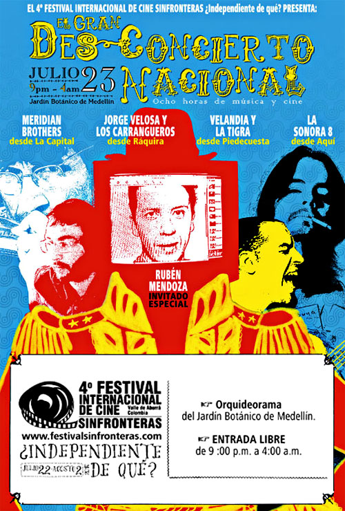 El cine del mundo se tomará Medellín y el Valle de Aburrá gracias a la cuarta versión del Festival Internacional de Cine Sinfronteras. Películas, directores, actores e historias que han recibido aplausos y ovaciones en festivales de la talla de Cannes, San Sebastián, Venecia, Londres, Nueva York, Málaga y Guadalajara, poblarán las pantallas del 22 de julio al 2 de agosto. Además de cine, invitados nacionales e internacionales, eventos teóricos y actividades llenas de especiales dosis de reflexión y análisis permitirán que durante 12 días todos los asistentes intenten responder a la pregunta “¿Independiente de qué?”. El primer espacio para discutirlo será el Des-Concierto Nacional en el Jardín Botánico el 23 de julio de 9:00 p.m. a 3:00 a.m.