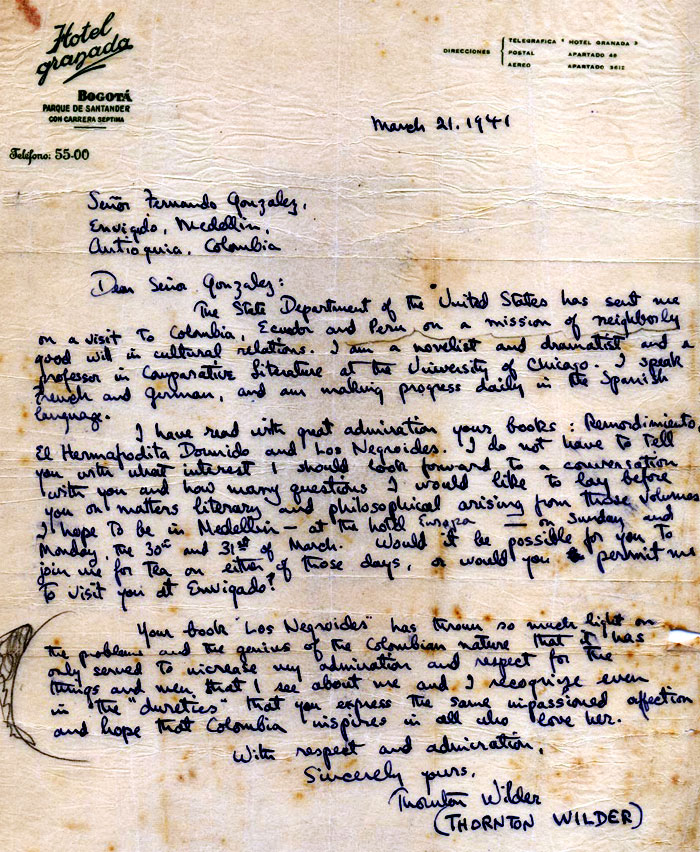 Durante los meses de marzo, abril y mayo de 1941, Thornton Niven Wilder, novelista y dramaturgo norteamericano, realizó una gira por Colombia, Ecuador y Perú en cumplimiento de una misión de buena voluntad en relaciones culturales, conferida por el Departamento de Estado de los Estados Unidos. Precedido de merecida fama como ganador en dos veces del Premio Pulitzer (en 1928 con The Brigde of San Luis Rey y en 1938 con Our Town), Wilder, profesor de la Universidad de Chicago, fue recibido con respeto y entusiasmo en los países mencionados, en los cuales tuvo la oportunidad de entrevistarse con numerosos literatos: Guillermo Valencia, Baldomero Sanín Cano, Eduardo Caballero Calderón, Rafael Maya, Jorge Icaza, Demetrio Aguilera, Ciro Alegría, José María Arguedas, Jorge Fernández, Humberto Salvador, Romero Castillo, Xavier Abril, Jorge Basadre, Héctor Velarde, etc.