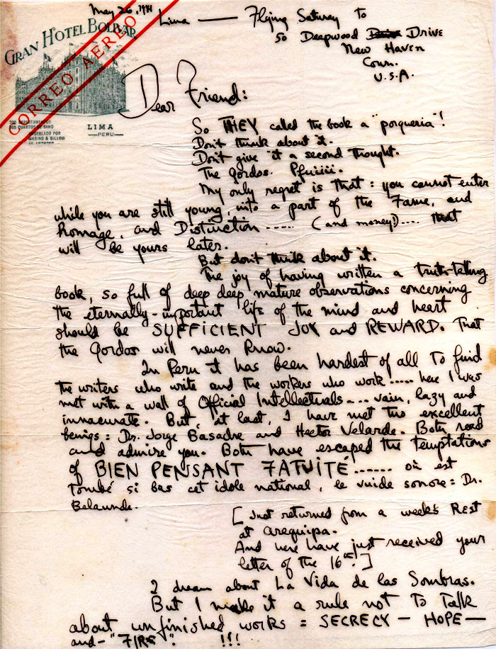 He leído con una gran admiración sus libros: El remordimiento, El Hermafrodita dormido, y Los negroides. No tengo que decirle con cuánto interés espero tener una conversación con usted, ni cuántas preguntas me gustaría ofrecer a su consideración, en materias literarias y filosóficas, nacidas de la lectura de esos volúmenes.