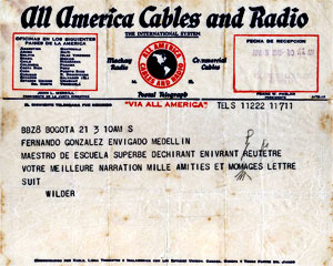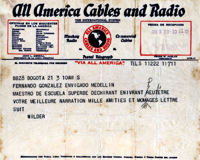 Una vez más en Bogotá, Wilder dirigió una nueva carta a Fernando González con fecha 4 de abril, en la cual consigna este sentimiento: «Mi experiencia más viva, estimulante y feliz en Colombia es haberlo conocido a usted, su trabajo y su casa». Gratamente sorprendido con la dedicatoria de El maestro de escuela, le escribe desde Quito el 11 de abril: «Es el primer libro que jamás ha sido dedicado a mí», y agrega: «Non dignus sum, non dignus sum».
