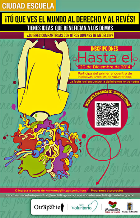 Conscientes del potencial humano y cívico de nuestros jóvenes, la Secretaría de Cultura Ciudadana y la Secretaría de Juventud del Municipio de Medellín hacen un llamado a toda la comunidad para que los jóvenes con edades entre los 14 y los 28 años se inscriban al primer Encuentro de Iniciativas Juveniles de Voluntariado y participen con sus iniciativas en la transformación de nuestra ciudad y de nuestra relación con ella.