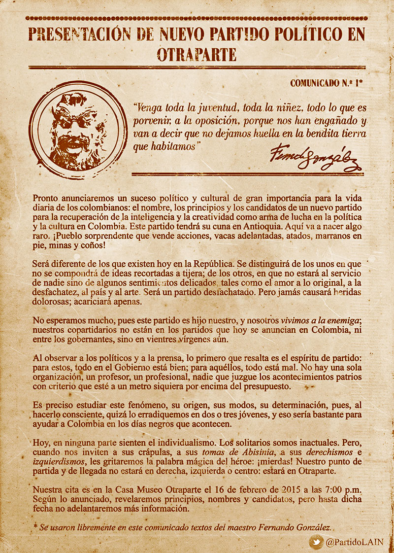 Pronto anunciaremos un suceso político y cultural de relevante importancia para la vida diaria de los colombianos: el nombre, los principios y los candidatos de un nuevo partido para la recuperación de la inteligencia y la creatividad como arma de lucha en la política y la cultura en Colombia. Este partido tendrá su cuna en Antioquia. Aquí va a nacer algo raro. ¡Pueblo sorprendente que vende acciones, vacas adelantadas, atados, marranos en pie, minas y coños!