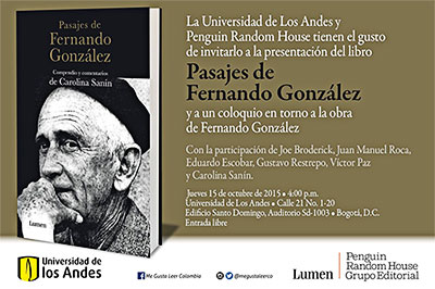 Penguin Random House, la Universidad de Los Andes y la Corporación Otraparte tienen el gusto de invitarle a la presentación del libro “Pasajes de Fernando González” y a un coloquio en torno a la obra del “Brujo de Otraparte”. Con la participación de Joe Broderick, Juan Manuel Roca, Eduardo Escobar, Gustavo Restrepo, Víctor Paz Otero y Carolina Sanín.