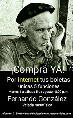 La puesta en escena de Fernando González – Velada Metafísica quiere crear la maravillosa ilusión de que todavía está en su granja de Otraparte, en Envigado, que los colombianos podemos seguir conversando con él. Hay dos hombres que fueron tierra de la tierra y no deberían haberse muerto nunca. El otro es Sócrates.