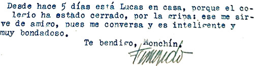 Recibimos también las tarjetas de Navidad para todos. Muy bellas. Tu mamá y los muchachos gozaron mucho. Ayer estuvimos en la misa de gallo aquí donde las monjas de al lado; comulgué por ti. Estuvieron el Dr. Orozco Micolta y doña Ema. Lucas gozó mucho; se acostó a las 11.