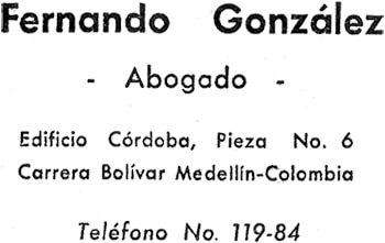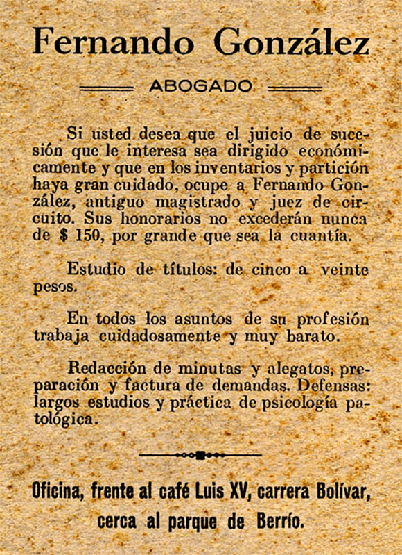 «La abogacía, en su modalidad de litigio, resultó para Fernando González una actividad adicional y esporádica. Recién egresado de la universidad la ejerció en la oficina de dos prestigiosos abogados de Medellín: Fernando Isaza y Gustavo Escobar. Más tarde, por temporadas, en períodos de intervalo de su desempeño como cónsul, magistrado o juez. Aunque el Derecho Civil era la disciplina que conocía más a fondo, tuvo también intervenciones en el ramo penal, casi siempre como defensor de oficio».