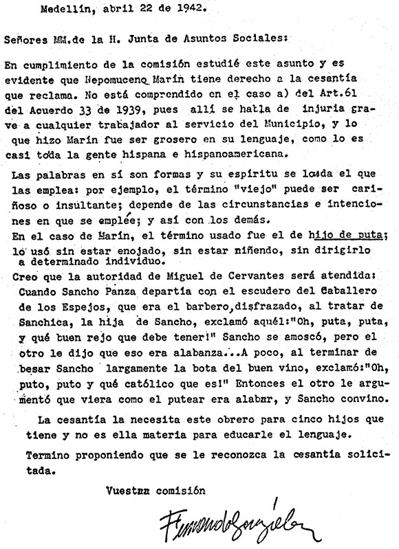 Preciso es distinguir entre el escritor que investiga y piensa, que sabe valerse donde pueda faltar el inmediato arrimo de ajena doctrina, y el escritor que en sus producciones se limita a transcribir y a presentar como propio lo que otros ya pensaron y escribieron. […] Injusto, pues, sería el que se me tildara que mire la Tesis que, para optar el grado de doctor en Derecho y Ciencias Políticas, ha sometido a mi estudio el Sr. D. Fernando González como inequívoca señal de que él es capaz de lo que no son capaces todos nuestros graduandos. Esto, y el conocimiento personal que como Profesor de la Facultad tengo de las grandes capacidades intelectuales de González, me habilitan quizás para reconocer en él a uno de los jóvenes más inteligentes entre los que en los últimos años han frecuentado las aulas de la Escuela de Derecho de la Universidad de Antioquia. La Tesis aludida es un trabajo sintético de valía incontestable […]. Hecha la anterior observación, sólo me resta manifestar […] que la Tesis mencionada llena superabundantemente las exigencias reglamentarias, y que el nuevo doctor será, a no dudarlo, por razón del grande acervo de sus conocimientos jurídicos, un timbre más de honor para nuestra Universidad.