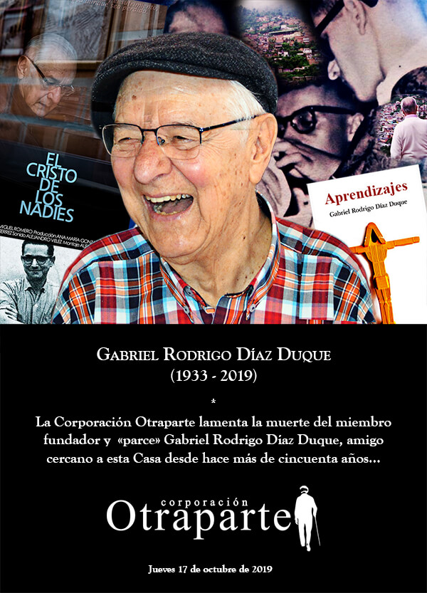 La Corporación Otraparte lamenta la muerte de su miembro fundador Gabriel Rodrigo Díaz Duque (Santo Domingo, Antioquia, 1933 – El Retiro, Antioquia, 2019), sacerdote, cómplice de poetas maldicientes, cantante apasionado, compañero de lucha de campesinos y pobladores urbanos. En los años sesenta perteneció al grupo Golconda junto a otros sacerdotes que se alzaron las sotanas para caminar entre el barro de los sectores populares. Con la publicación de su autobiografía «Aprendizajes» en 2012, el Grupo de Investigación en Historia Social de la Universidad de Antioquia presentó el testimonio de este hombre que gozó y celebró la vida religiosa como una experiencia histórica. El libro es una memoria sensible y cálida sobre sus muchos años de «aprender y desaprender» en el mundo, y en él se narra la historia del «Cristo de 49 pesos» construido en 1968 por la comunidad en el barrio Santo Domingo Savio de Medellín, historia que a su vez inspiró el cortometraje «El cristo de los nadies» de Miguel Ángel Romero. Así mismo, el «parce» Gabriel —así le gustaba que lo llamaran— publicó en 2016 «Para nunca envejecer», testimonio de su amistad con Álvaro Villa, Matías Posada y Fernando González Restrepo, sus tres «hermanos y maestros».