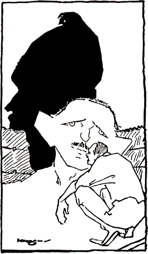 «Lucas Ochoa contempla cómo la sombra de Fernando González se convierte en la figura del Libertador». Caricatura de Horacio Longas, publicada en octubre de 1930 con motivo de la aparición de la primera edición de Mi Simón Bolívar.