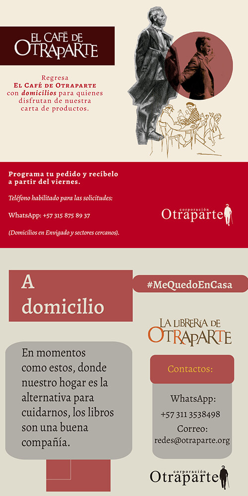 Regresa El Café de Otraparte con domicilios para quienes disfrutan nuestra carta de productos. Si bien la magia del espacio les seguirá esperando, ahora tenemos la posibilidad de llevar una pizca de Otraparte a otras partes, así como los ejemplares disponibles en La Librería de Otraparte. Ver la carta de domicilios del Café y el inventario de la Librería.