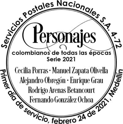 El Ministerio de Tecnologías de la Información y las Comunicaciones, Servicios Postales Nacionales S. A. 4-72, la Universidad de Antioquia y la Corporación Otraparte se unen en la presentación de la emisión filatélica «Personajes colombianos de todas las épocas» (serie 2021), que rinde homenaje al escritor Fernando González Ochoa, al médico, antropólogo, folclorista y escritor Manuel Zapata Olivella y a los artistas plásticos Alejandro Obregón, Cecilia Porras, Enrique Grau y Rodrigo Arenas Betancourt.