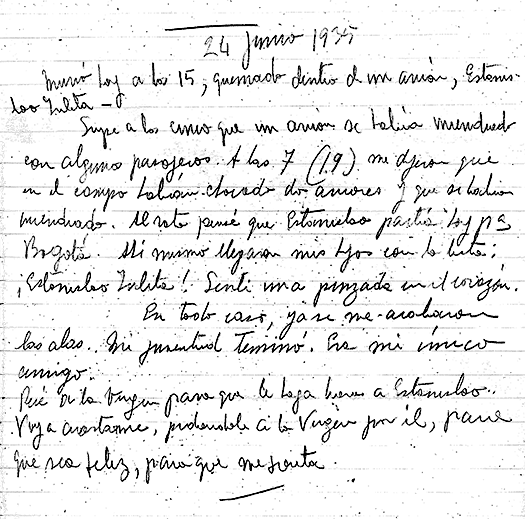 24 junio 1935: «Murió hoy a las 15, quemado dentro de un avión, Estanislao Zuleta. Supe a las cinco que un avión se había incendiado con algunos pasajeros. A las 7 (19) me dijeron que en el campo habían chocado dos aviones y que se habían incendiado. Al rato pensé que Estanislao partía hoy para Bogotá. Ahí mismo llegaron mis hijos con la lista: ¡Estanislao Zuleta! Sentí una punzada en el corazón. En todo caso, ya se me acabaron las alas. Mi juventud terminó. Era mi único amigo. Recé a la Virgen para que le haga bienes a Estanislao. Voy a acostarme, pidiéndole a la Virgen por él, para que sea feliz, para que me sienta».