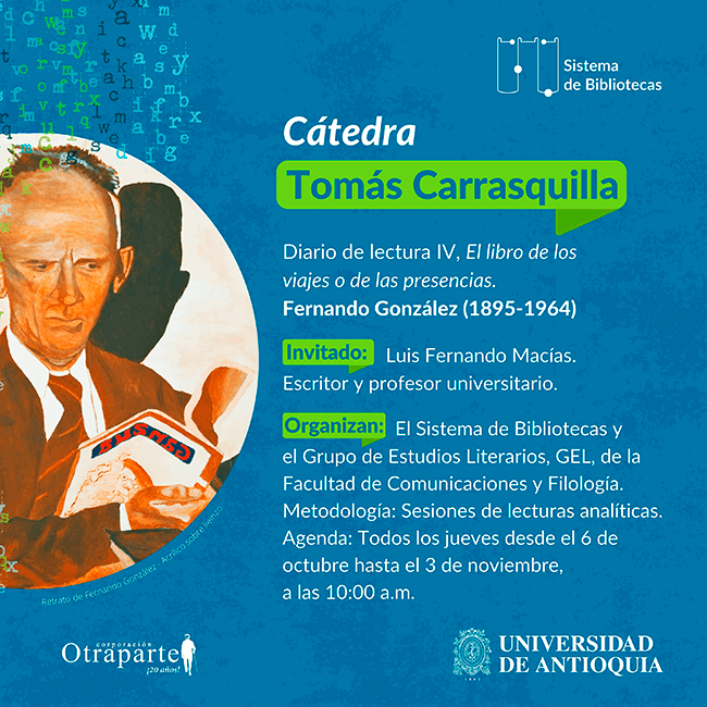 La Cátedra Tomás Carrasquilla, iniciativa que lideran la Facultad de Comunicaciones y Filología y el Sistema de Bibliotecas de la Universidad de Antioquia, ofrece el seminario de lectura directa y paso a paso del Diario de lectura IV: Libro de los viajes o de las presencias de Luis Fernando Macías, con especial dedicación al conocimiento de la vida y obra del maestro Fernando González.