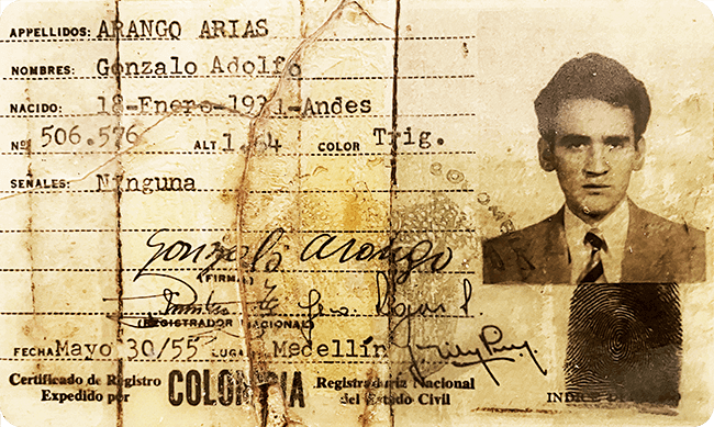 1. Cédula original de Gonzalo Arango, donada por Jotamario Arbeláez a la Casa Museo Otraparte en febrero de 2023; 2. Amílcar Osorio (Amílkar U.) y Gonzalo Arango; 3. Gonzalo Arango; 4. Gonzalo Arango con don Cantalicio en Todaspartes; 5. Jotamario Arbeláez.