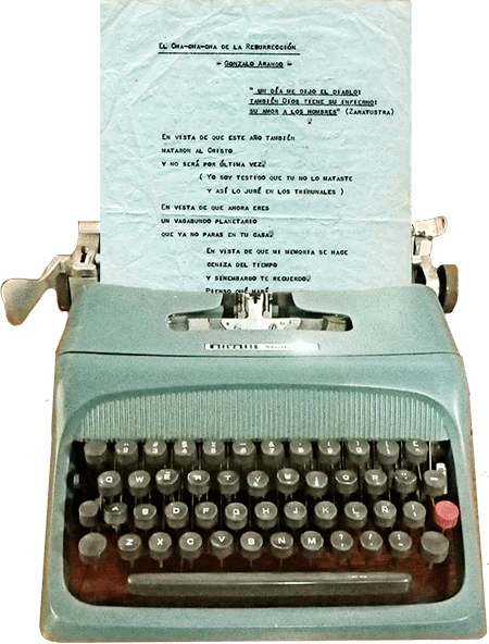 La máquina de Gonzalo Arango en que verso estas prosas era a la vez instrumento principal y batuta. Alimentados con café tinto, insomnio y aceite tres en uno, despachábamos a diario cientos de líneas como teletipos impenitentes. Del obstinado manifiesto al poema desvertebrado, de las cartas de amor al eterno ensayo de moda demoledor, de los pactos secretos al escándalo público, entre todos tejíamos la tela del desastre como un gran juego de palabras cruzadas.