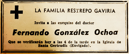 La mañana del 15 de febrero de 1964 emprendía yo mi viaje para Centro América, yendo antes a Cali para despedirme de un matrimonio joven cuya boda había bendecido como sacerdote. Aquella misma noche llamaron por teléfono desde Medellín. Cuando la señora colgó me dijo que al doctor Fernando González le había dado un infarto y que estaba muy grave. En la forma que me lo dijo le repliqué alarmado: «Ha muerto», y ella: «No, nooo, nooo…», y en los largos noes yo entendí el sí. Llamé inmediatamente a Beatriz Restrepo para preguntarle si el Mago había muerto y me contestó como su prima: «No, nooo, nooo, pero está muy mal». «¿No cree, Beatriz, que yo debería volver mañana?». Su afirmación me deparó una noche blanca, que era lo que aquellas buenas señoras trataron de evitarme con sus noes.