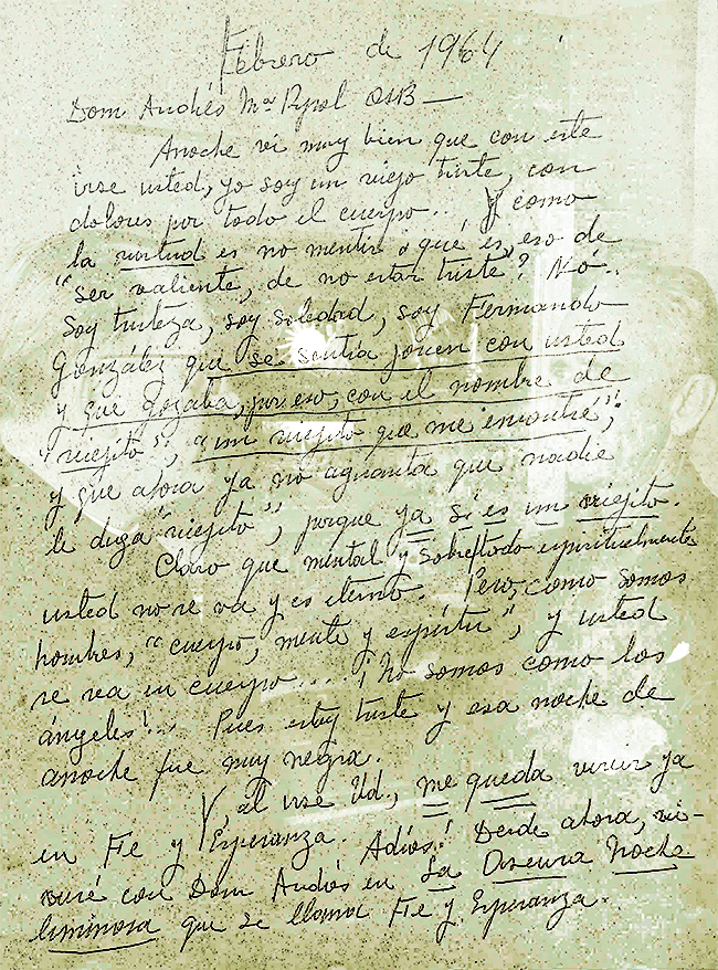 Días antes de escribirme su última carta, triste por mi ya próxima partida, me espetó: «Ud. que se va y yo que me muero», e inició el gesto de levantar sonriente su angelical mirada y su diestra a lo alto, y añadió: «Pero qué le hace…». Como polluelo asustado que busca la madre, yo le repuse: «Pero, doctor, no diga eso; nuestra amistad ha llegado en la Presencia a un punto que si uno se va —yo me iba entonces para Centro América— es como si no se fuera, y si uno de los dos muere es como si no muriera». Y me retiré también triste, muy triste, temiendo que aquella afirmación se hiciera realidad, como tantas veces que en su intuición devenían realidades sus profecías.