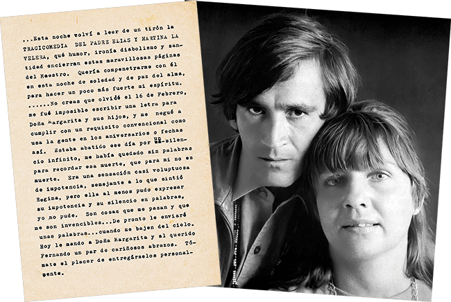 No creas que olvidé el 16 de febrero, me fue imposible escribir una letra para doña Margarita y sus hijos, y me negué a cumplir con un requisito convencional como usa la gente en los aniversarios y fechas así. Estaba abatido ese día por un silencio infinito, me había quedado sin palabras para recordar esa muerte, que para mí no es muerte. Era una sensación casi voluptuosa de impotencia, semejante a lo que sintió Regina [Mejía], pero ella al menos pudo expresar su impotencia y su silencio en palabras, yo no pude. Son cosas que me pasan y que me son invencibles… De pronto le enviaré unas palabras… cuando bajen del cielo. Hoy les mando a doña Margarita y al querido Fernando un par de cariñosos abrazos. Tómate el placer de entregárselos personalmente.