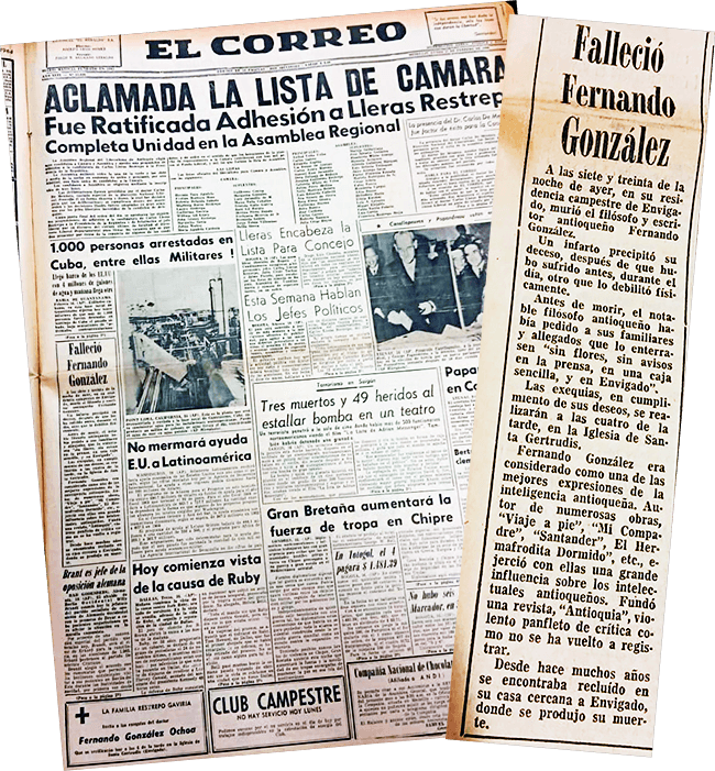 En el recatado cementerio de la vecina urbe industrial de Envigado, «sin avisos de prensa», como lo había pedido para conservar la originalidad hasta el último momento, y con coronas —contra su voluntad— fue depositada ayer la envoltura carnal del maestro Fernando González, el hombre de «las presencias», el panfletario, filósofo y hombre de letras.