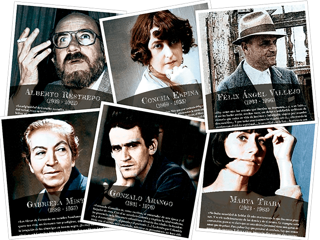 Alberto Aguirre (1926-2012), Alberto Restrepo (1939-2022), Andreu Ripol Noble (1910-2002), Benjamín Correa (1888-1974), Concha Espina (1869-1955), Débora Arango (1907-2005), Dora Ramírez (1923-2016), Félix Ángel Vallejo (1903-1996), Gabriela Mistral (1889-1957), Gonzalo Arango (1931-1976), León de Greiff (1895-1976), Manuel Mejía Vallejo (1923-1998), María Helena Uribe (1928-2015), Marta Traba (1923-1983), Olga Elena Mattei (1933), Óscar Hernández (1925-2017), Pedro Nel Gómez (1899-1984), Regina Mejía (1929-2012), Rosemary Smith (1932-2010), Teresa de la Parra (1889-1936), Thornton Wilder (1897-1975), Tomás Carrasquilla (1858-1940).
