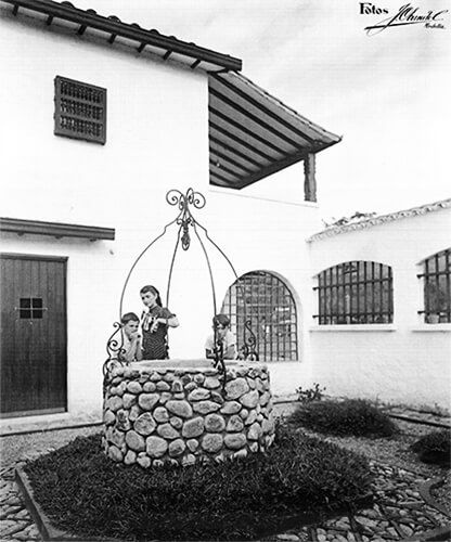 “Doña Margarita Restrepo de González con Fernandito y Simón, ante el pozo de la Samaritana”. Esta fotografía de Jorge Obando acompaña el reportaje “Fernando González me dijo…” de Luis Enrique Osorio, publicado en la revista Cromos en marzo 7 de 1942. Fotografía por Jorge Obando.
