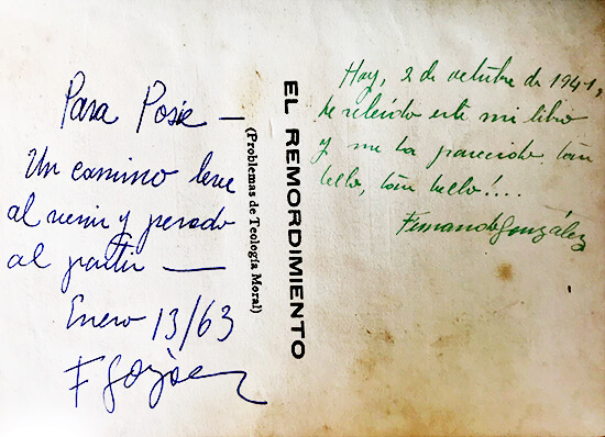 Dedicatoria de Fernando González en su ejemplar de El remordimiento para Rosemary Smith, también conocida como «Posie» o «Rosa Girasol», artista plástica y nadaísta: «Para Posie, un camino leve al venir y pesado al partir. Enero 13 / 63». Se lee, además, a la derecha: «Hoy, 2 de octubre de 1941, he releído este mi libro y me ha parecido tan bello, tan bello!…». Ver «El nadaísmo y la mujer».