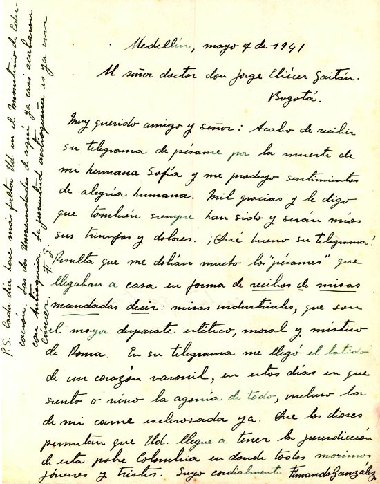 Carta de Fernando González a Jorge Eliécer Gaitán. Cortesía de su hija Gloria Gaitán Jaramillo. Ver transcripción de la carta aquí.